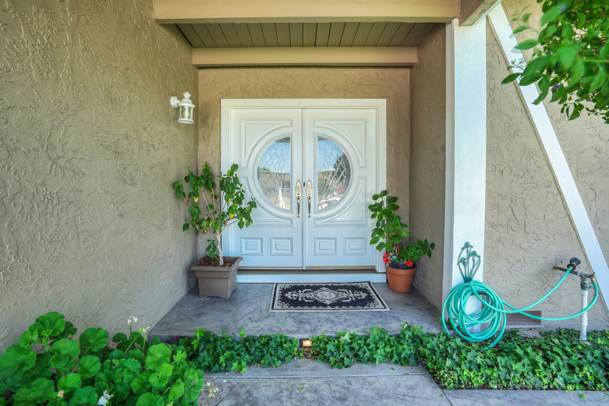 - Meticulously landscaped with a stamped concrete driveway and a large grass area with foliage around the perimeter and views of the hills. A covered porch shields guests from the elements as they enter this magnificent home through the beautiful double doors with beveled glass.