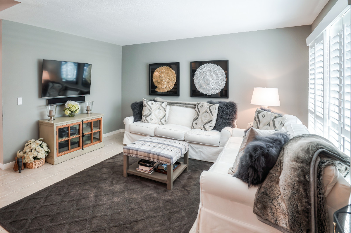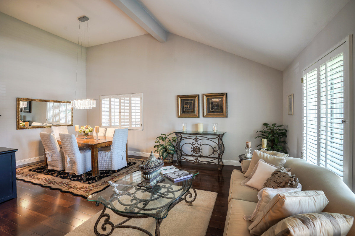 - Living room has a peaked ceiling and a window with plantation shutters.