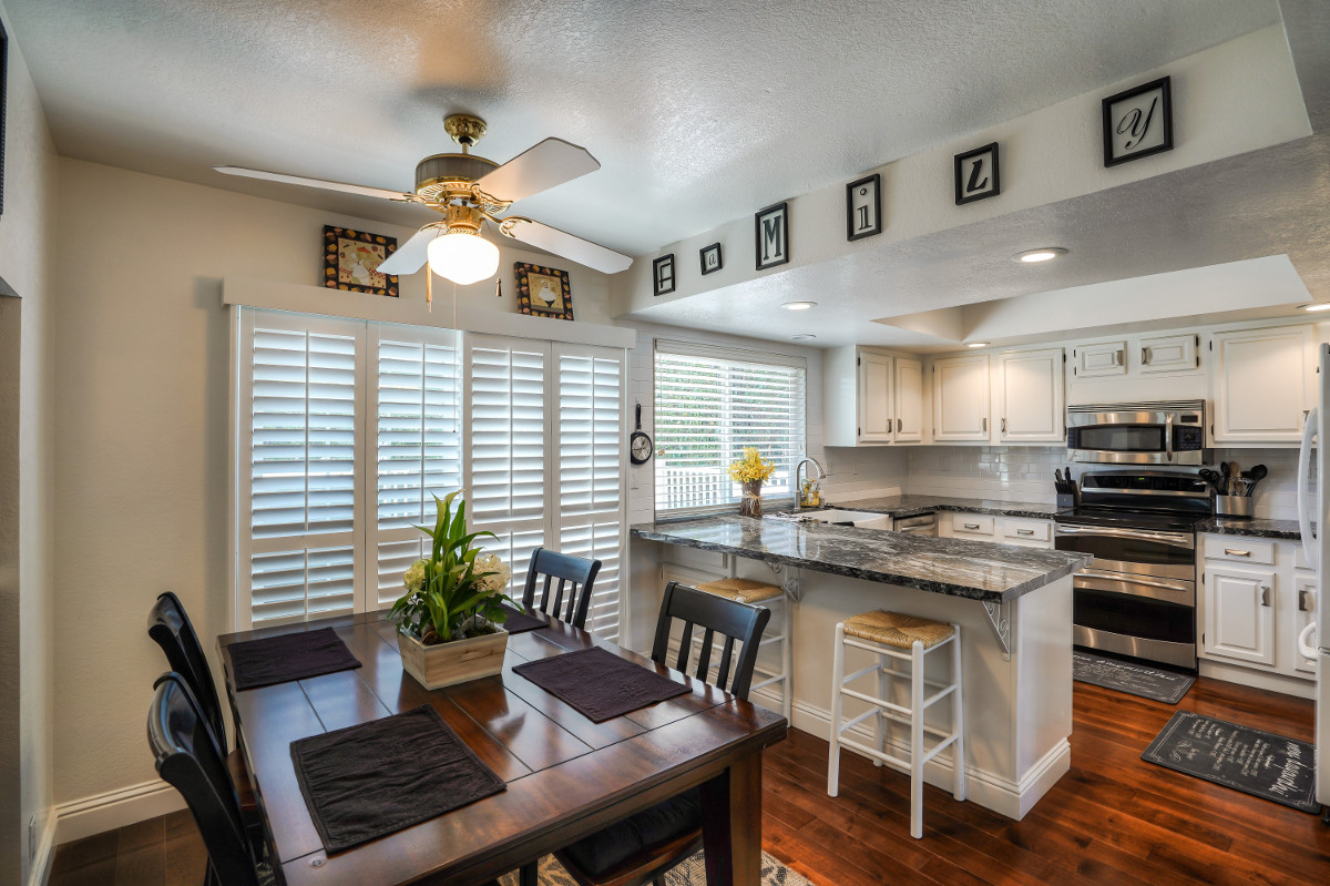 - Dining room has a high ceiling, stunning light fixture and a window with plantation shutters. Great for dinner parties!