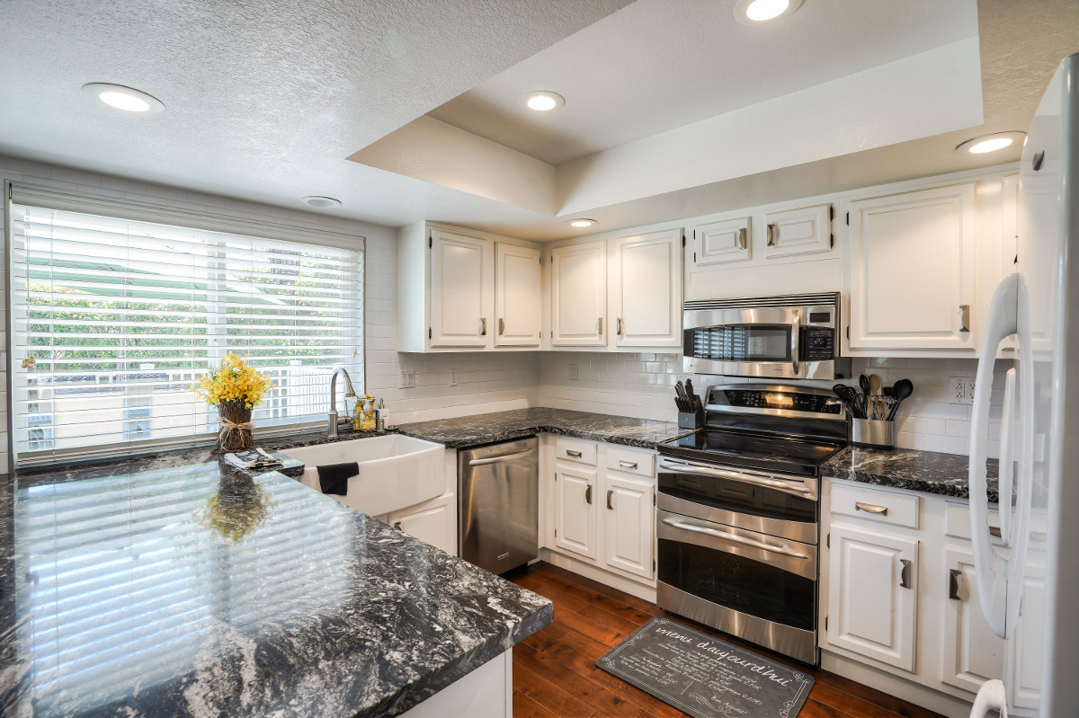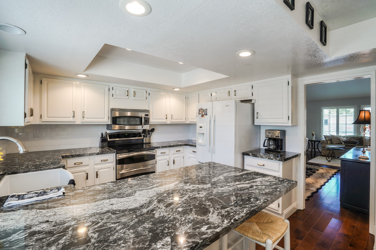 - Pocket door opens to this fabulous kitchen with granite slab counters, subway tile backsplash, plenty of white cabinetry, a tray ceiling with recessed lights and apron kitchen sink. Stools can be used for under-countertop seating. Appliances include a Maytag French Door Refrigerator, stainless dishwasher, GE Profile microwave and an electric 5-burner range with broiler and oven. Dine-in area has a ceiling fan, pantry, plus has a slider that provides access to the outdoor deck.
