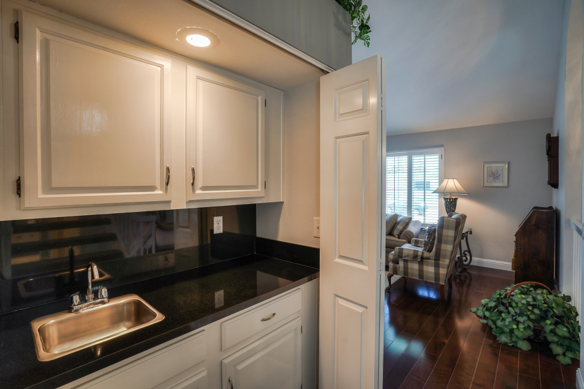 - Wet bar is concealed by bi-fold doors and has a sink, granite slab counter, plenty of built-in storage and a recessed light. Storage closet also available.