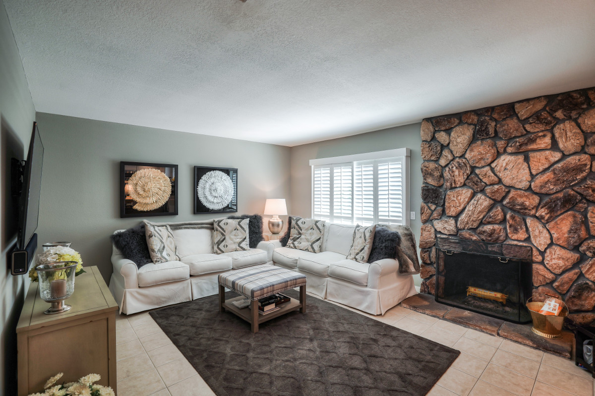 - Step down to the family room, the focal point is the large wood-burning fireplace, there is tile flooring plus a sliding glass door with plantation shutters with access to back patio.