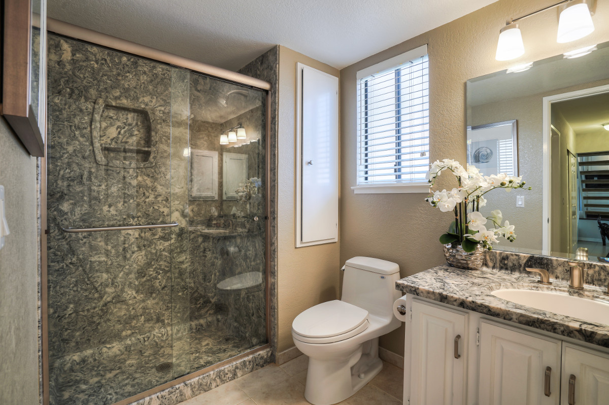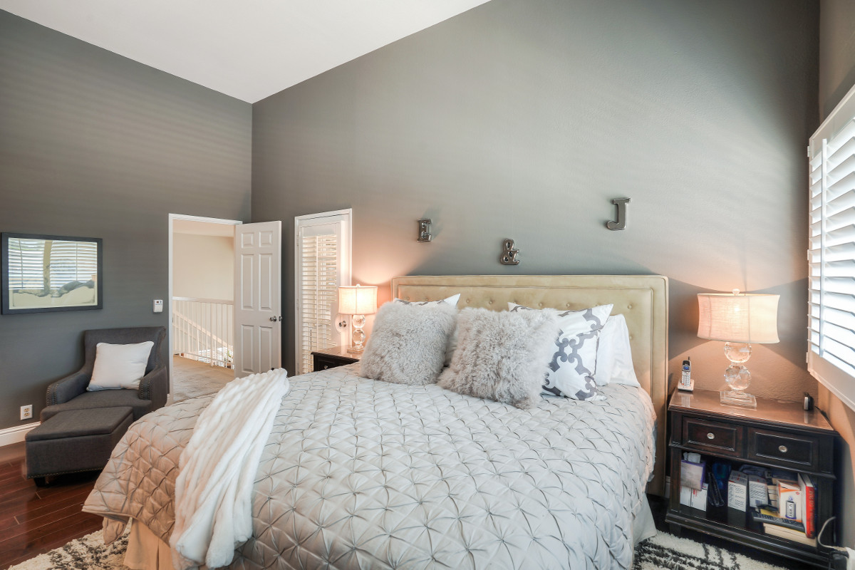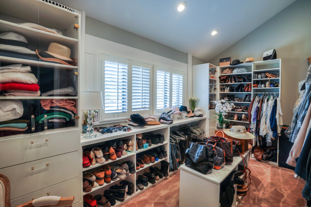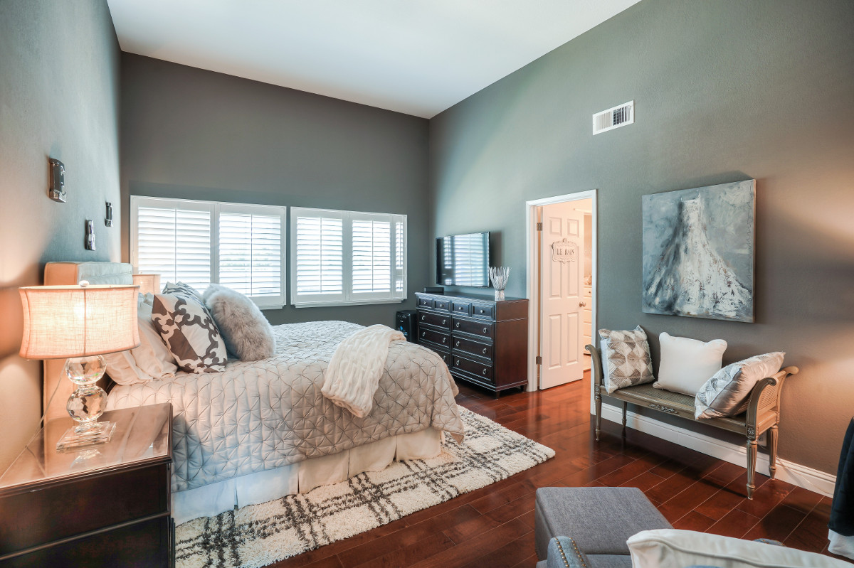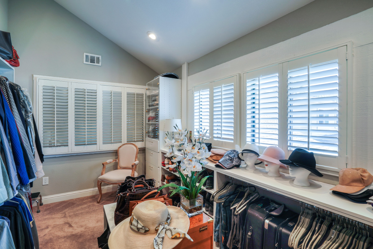 - Spacious master bedroom suite is an aesthetic retreat that gives you a soothing personal sanctuary right at home. This room has a high ceiling, hardwood flooring, room for a sitting area and two large windows with plantation shutters that provide fabulous views of the hills. An enormous walk-in closet with organizers and a storage island in the center is a dream come true. This walk-in closet also has recessed lights, windows with plantation shutters and a stunning glass entrance door with custom shutters.