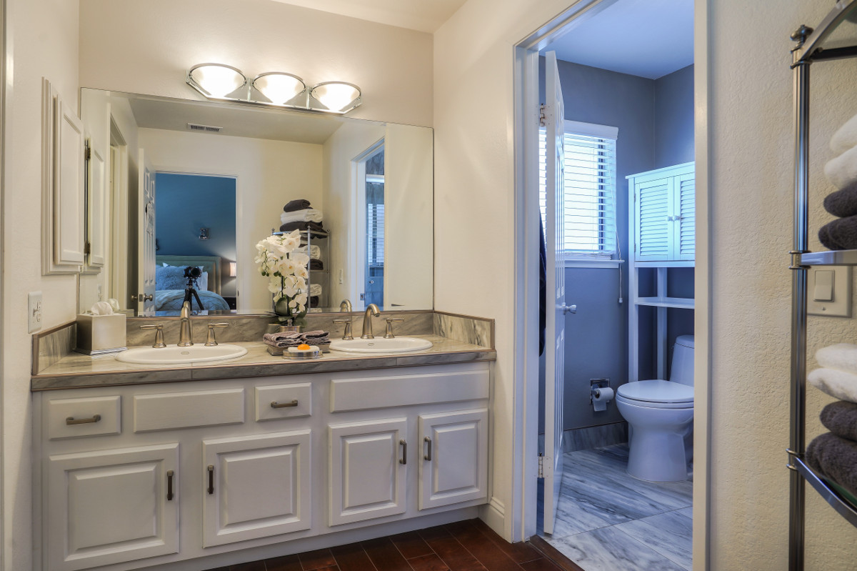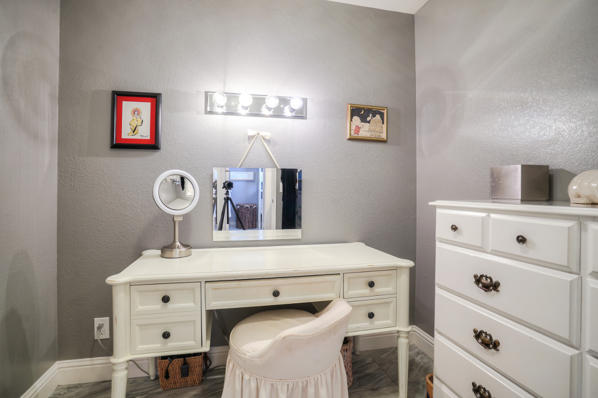 - En suite is divided into three separate areas: Vanity area has hardwood flooring, dual sinks, tile counter and a large mirror over the vanity. A separate makeup room with tile flooring and a ceiling mount light fixture. Water closet has a tile floor, separate shower stall with tile surround and frameless glass enclosure plus a frosted window for privacy.