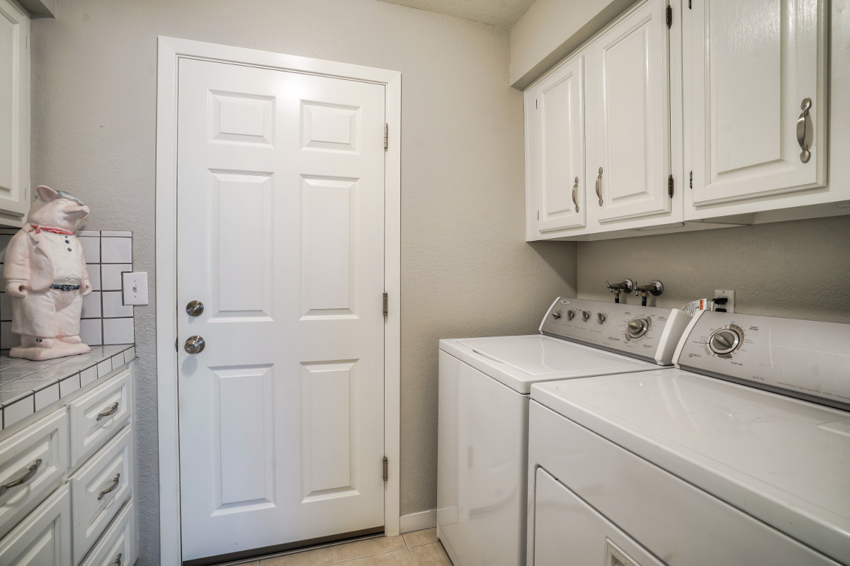- Bi-fold doors conceal laundry room with tile flooring, sink area, tile counter, built-in overhead cabinets plus room for a full-size washer and dryer.