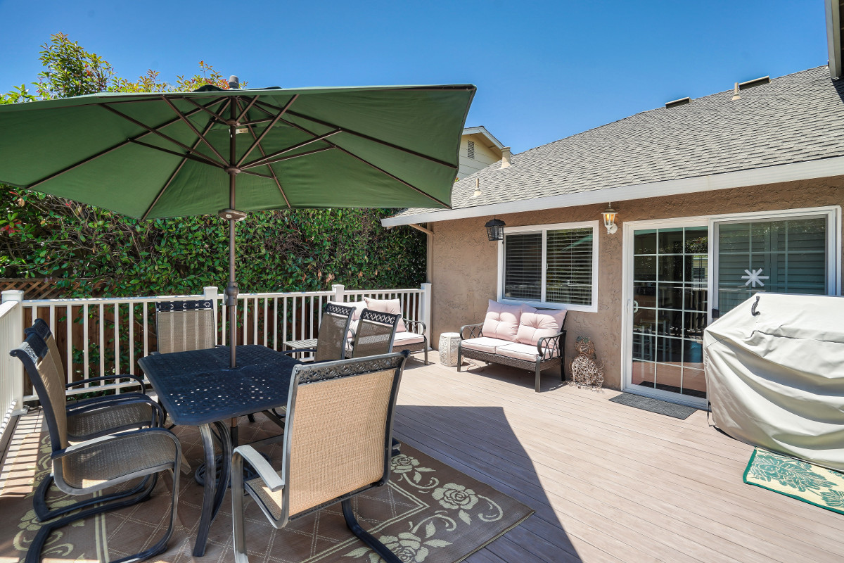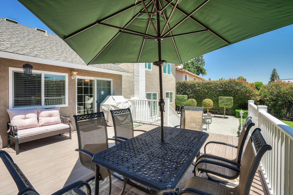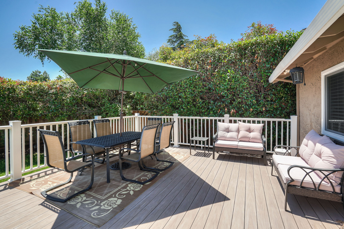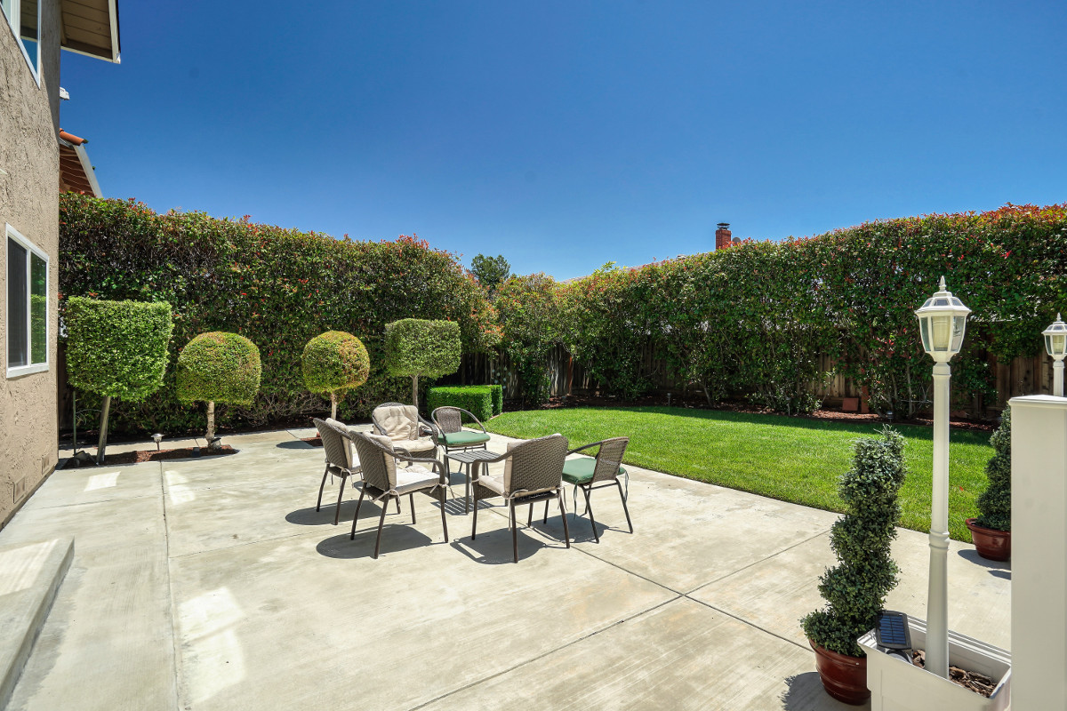 - Fenced for privacy, this good-sized backyard has a large deck off the kitchen area with room for a table and plenty of seating that steps down to a concrete patio which comprises the ideal chilling, cooking, playing and entertaining space. There is also a large grass area and the entire perimeter was lined with mature trees that gave the area a lush look and screened out views of neighbors. Any way you look at it, this yard is great for entertaining!