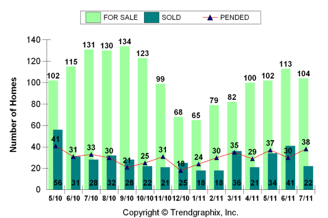 As anticipated, the market is continuing to show signs of improvement. The number of available single family properties decreased from last week’s 98 to 97 this week. The percentage of listings that are under contract has increased from 33% last week to 34% this week. Traditional (ie non-distressed) listings are showing the strongest improvement, with available properties dropping from 90 to 88 and the percentage under contract increasing from 24% to 27% over this same time frame. As students settle into the new school year, I expect more buyers to enter the market to take advantage of the lowering mortgage interest rates.